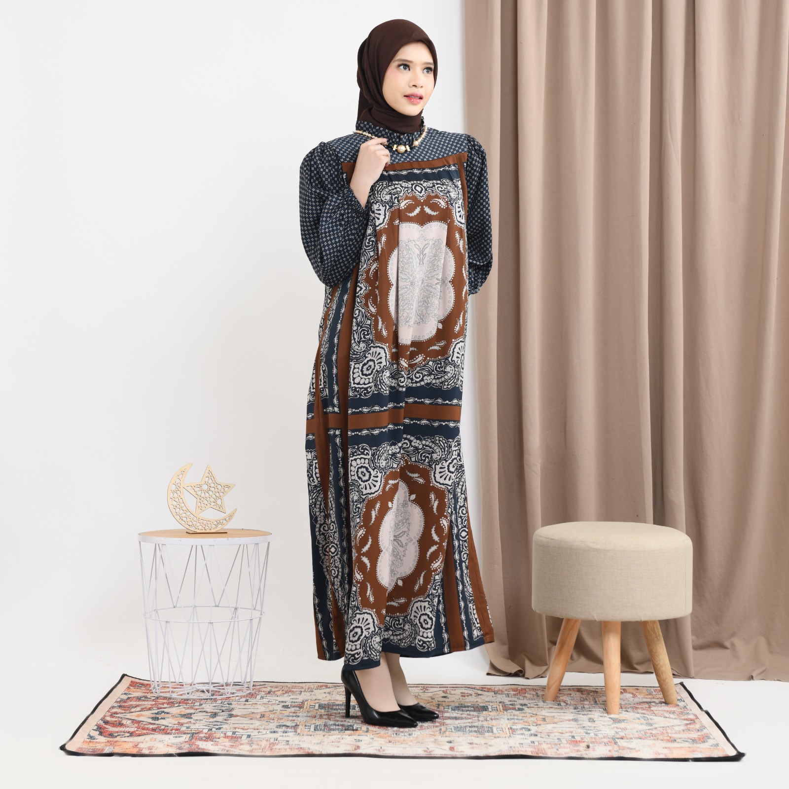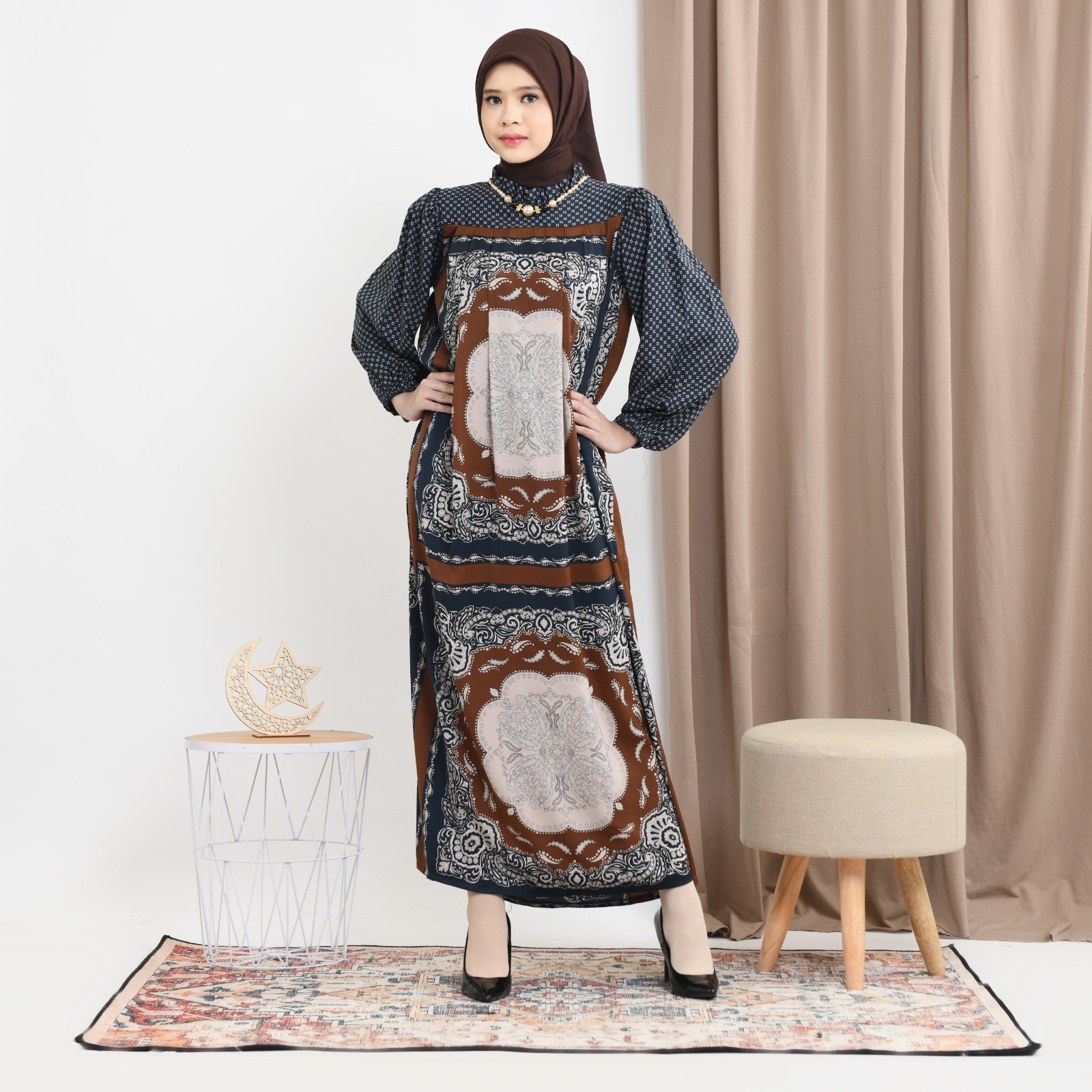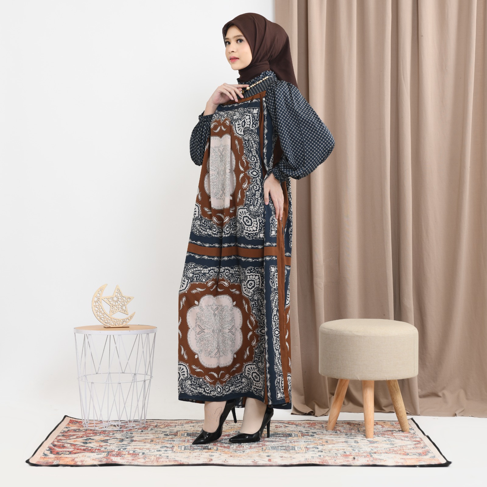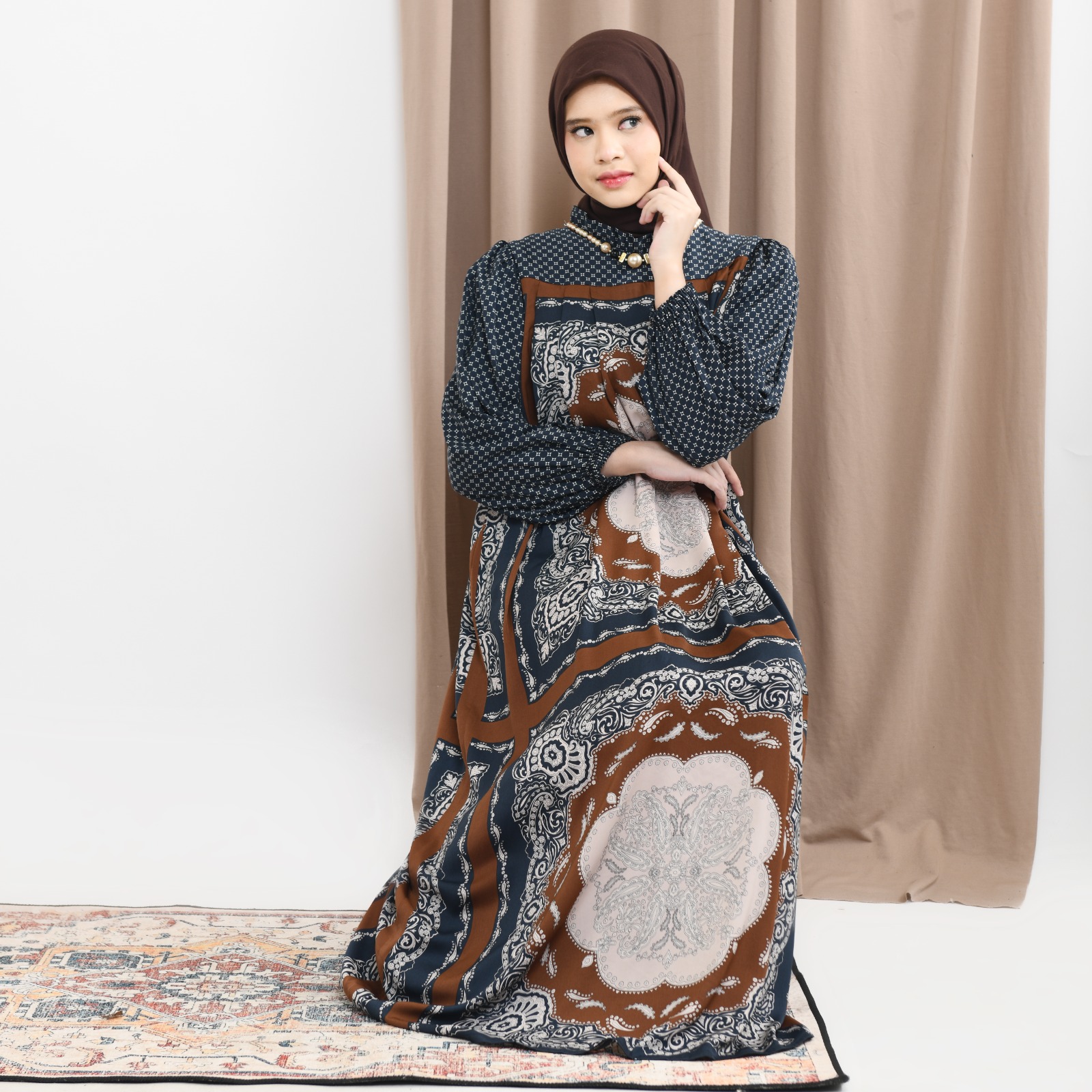 Gaun Fazluna dari Ridwan & Rahma Collection terbuat dari bahan silk dengan motif cetak khas.