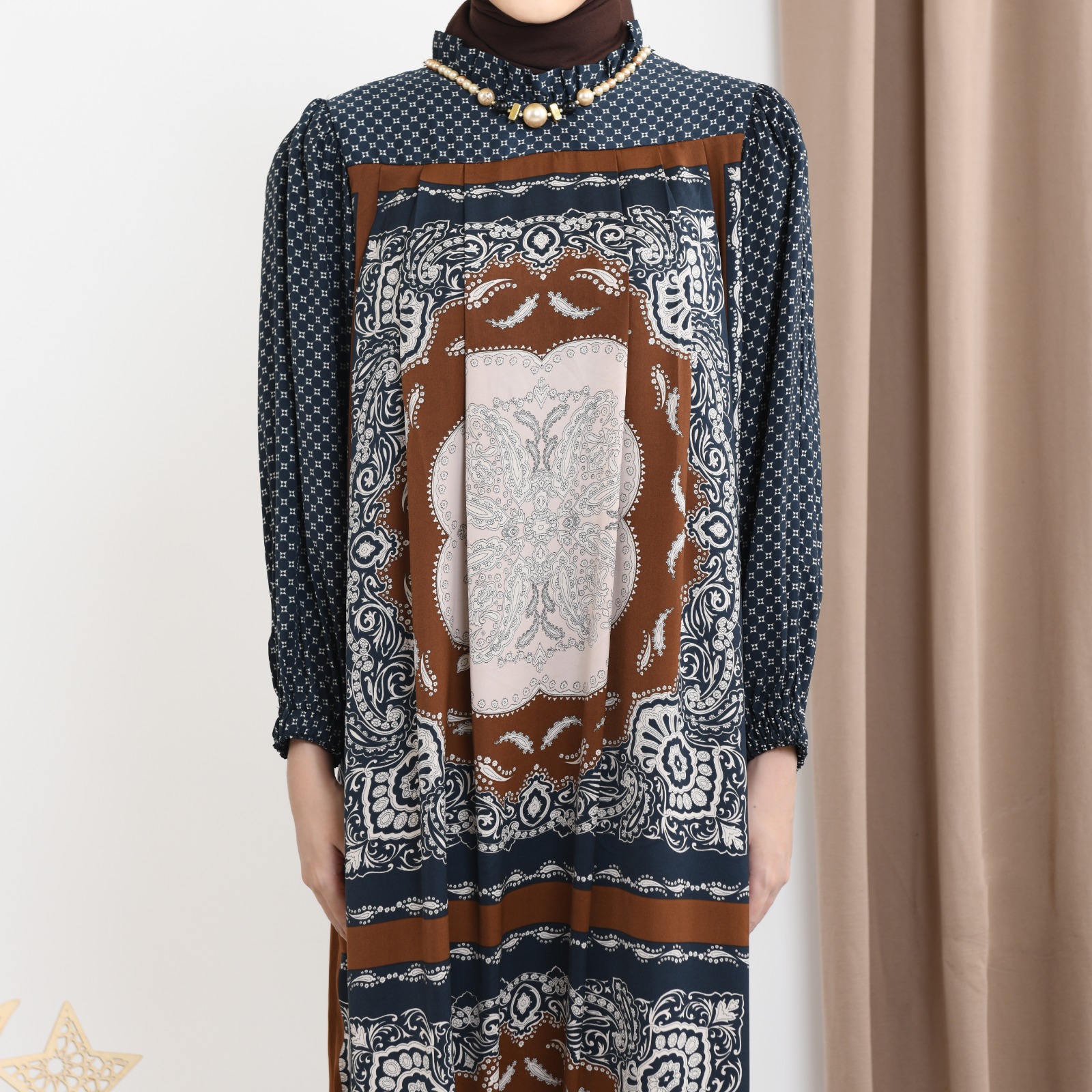 Model kerah berdiri dengan ruffle atau lipit-lipit dengan hiasan kalung manik2